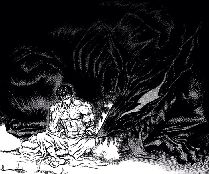 Guts is a man who in an attempt to overcome the causality of destiny itself has allowed himself to be consumed by his rage and hatred in order to battle back against demons. Clad in black armor and a helmet that is in the shape of an infernal hell hound (Gut’s inner beast) he wages war on the GodHand and it’s affiliates for the abominable acts they committed on his comrades and his love interest. However, the ferocity Guts uses in battle inspires not admiration but fear.